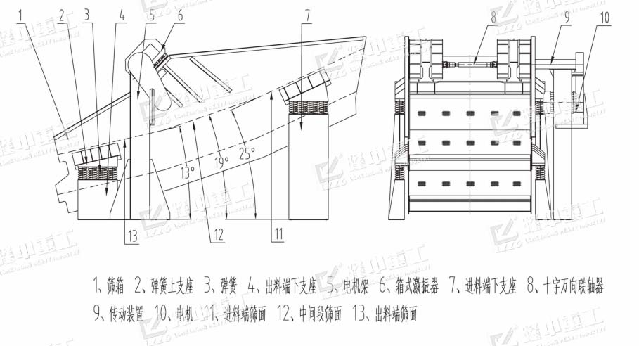 香蕉篩主要由篩箱、篩網、激振器、減振彈簧和下座架等組成。香蕉篩是由電動機和激振器作為振動源,激振器主要是由偏心軸、皮帶輪、軸承及軸承座等組成,激振器安裝在篩箱側板上,并由電動機通過三角皮帶或軟連接與其相連,電動機帶動偏心軸旋轉,產生離心慣性力,迫使篩箱振動。